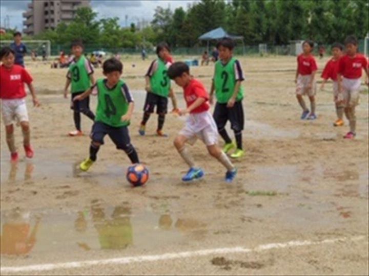 ボールは蹴っても飛ばす、パスはうまくつながらない、水たまりで思うようにコントロール出来ずドリブルも思うように進まない。そんな大変なグランド状態でしたが、ループパス、浮き球を使ってゴールを目指しました。結果は2試合引き分けでしたが、内容は違っていたね。 1試合目は終了直前に追いつかれてしまった。最後まで集中を切らさず守りきれるといいね。 2試合目は後半に追いつき同点。最後まであきらめずゴールに向かう姿がとても良かったです。 谷本コーチ、保護者の皆様、雨の中お疲れ様でした。 |